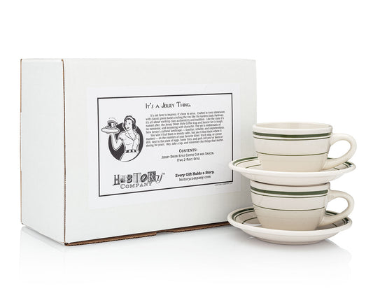 Jersey Diner Coffee Cup and Saucer – Authentic Classic Eggshell White with Green Bands – Two 2-Piece Sets (Gift Box Collection)